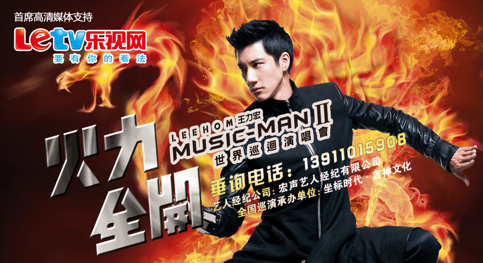 王力宏2012 MUSIC-MAN Ⅱ火力全开世界巡回演唱会北京站4月14日晚在国家体育场上演。王力宏不仅为歌迷带来数十首经典好歌,更使出十八般武艺,弹钢琴,拉二胡,弹贝司,拉小提琴……让观众high到过瘾。 本场演唱会,王力宏没有请同龄的当红歌手助阵,而是找来了两位李姓的嘉宾,一位是钢琴家李云迪,一位是《龙的传人》的原唱李建复。王力宏自称今年春晚交到了一个好朋友,他只有30岁,却很成熟,因为总是穿西装。两人先是合作了歌曲《落叶归根》,又对弹钢琴合奏《金蛇狂舞》。一黑一白两架钢琴在两位“才子”手下流出的音符,让全场high翻。
